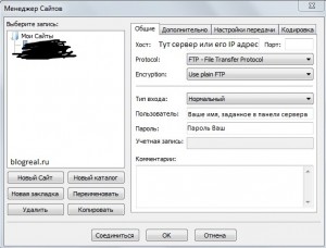 Нажимаем вверху: Файл->менеджер сайтов. Создаем в левой колонке filezilla сайт, далее справа заполняем поля, вот картинка: